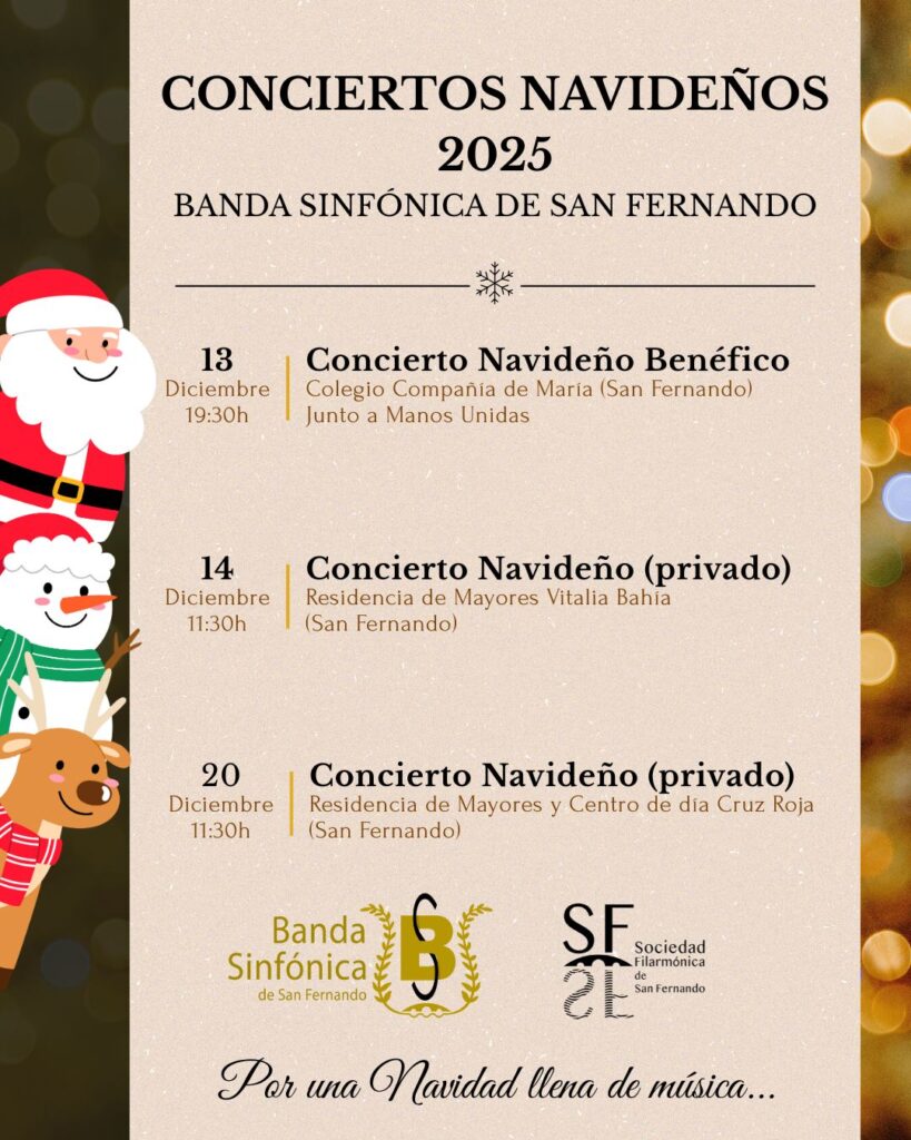 La Banda Sinfónica de San Fernando, desde la Sociedad Filarmónica de San Fernando, presenta su calendario de Conciertos Navideños para este mes de diciembre, bajo el lema «Por una Navidad llena de música…». La programación incluye un evento benéfico abierto al público y dos actuaciones privadas en residencias de mayores.